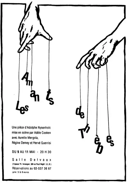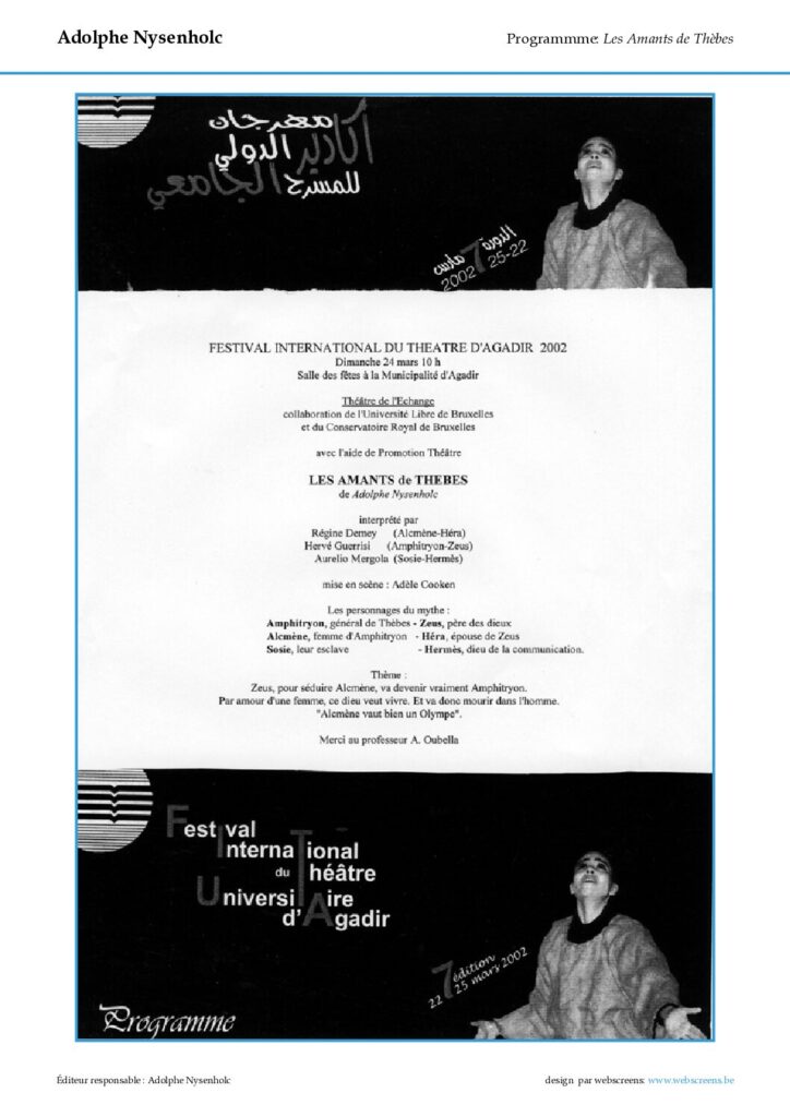 | Présentations : | – Quartiers Latins, le 29 mars 1990, interprété par le Théâtre du Rêve (Étudiants, ULB) ; dirigé par l’auteur. – Théâtre-Poème, dans le cycle « Pour relire la Grèce antique », le 26 janvier 1994, interprété par Monique Dorsel, Luc Vandermaelen, Yves Bical, Uta Wagner, Eric Parisis, Fabienne Crommelynck. – Cercle des Citoyens, 29 septembre 2001, à l’occasion des 30 ans du Théâtre de Feu, Mont-de-Marsan (Les Landes), 29-09-2001, Lecture scénique par l’auteur. – Les Vikings, Yvetot, 02-03-2002, (extrait), Lecture scénique par l’auteur. – Salle des Fêtes de la Municipalité, Festival international du Théâtre universitaire, Agadir (Maroc), 23 mars 2002, avec les étudiants du Conservatoire (Aurélio Mergola, Régine Demey, Hervé Guerrisi), scénographie : Marie Axelle Mazuc, mise en scène : Adèle Cooken ; et reprise Salle André Delvaux, ULB, Bruxelles, 9-11 mai 2002. – Salon bleu du Casino, Festival de Spa, 17 août 2002, lecture par l’auteur. – Théâtre Scarabaeus, mise en scène de Jean-Luc Impe, avec comédiens et marionnettes, novembre 2008, co-production L’Echange-Scarabaeus, projet en cours d’élaboration. |