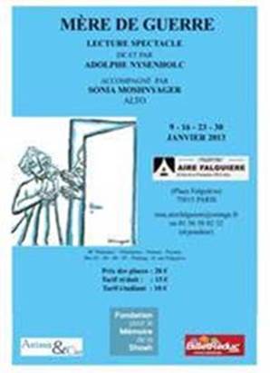 • Théâtre Aire Falguière, Prod. Anima & Cie d’Annie Rappoport, lecture-spectacle, animé de statuettes, avec Sonia Moshnyager (alto), avec l’aide de la Fondation pour la Mémoire de la Shoah, Paris, 9, 16, 23, 30 janvier 2013, 21h